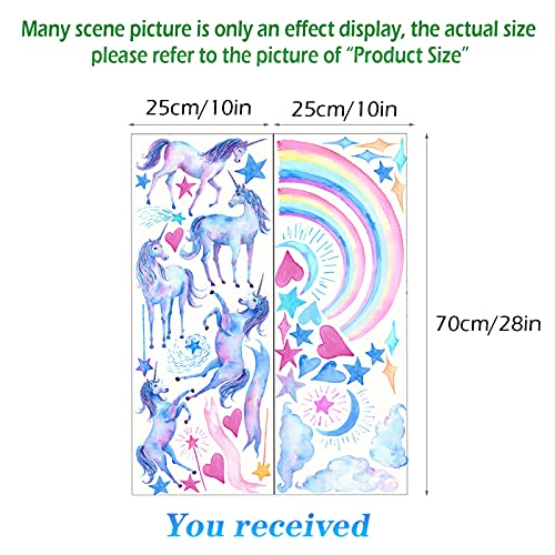 ???? 【Eenhoornstickers】 Het pakket bevat 2 vellen regenboogstickers op de muren. Elk vel meet ongeveer 25 x 70 cm (10 x 28 inch) en is een schattige decoratie voor de kinderkamer die kinderen een dromerige omgeving biedt om te vertoeven.