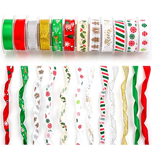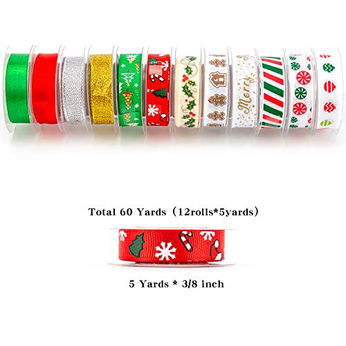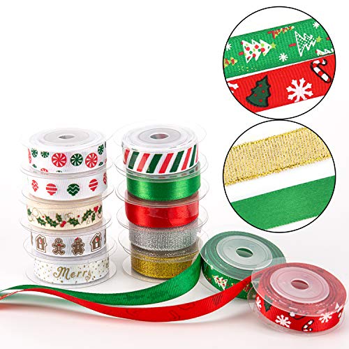 Inhoud pakket: 12 stuks kerstbandjes; afmetingen: elke rol met linten meet 14 cm x 8 cm, in totaal 60 yards. (4,57 mx 10 mm, totaal 54,86 m)