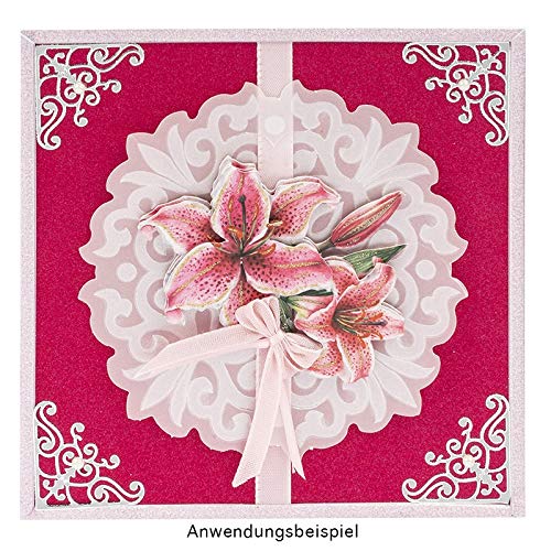 Maak eenvoudig en zeker prachtige wenskaarten, hangers, tafelkaarten, bladwijzers, geschenkdozen en nog veel meer. De grote doos kan direct als wenskaart worden gebruikt. Bijzonder stijlvol werkt een grote wenskaart in DIN-A5-formaat. De doos kan ook geweldig als achtergrond worden gebruikt. Knip hiervoor bijvoorbeeld geometrische vormen zoals rechthoeken of cirkels uit en leg er 3-D motieven mee.