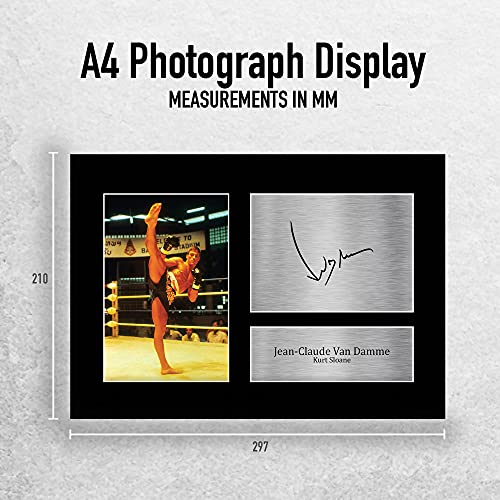 Professioneel gemaakt in onze studio, deze A4 (297x210mm) un-ingelijst Jean Claude Van Damme weergave zorgt voor een ideaal cadeau-idee. Deze laser geprinte kwaliteit foto is gemonteerd in een precisie gesneden drie vensters zuurvrij mat zwart weergave board. Links van het weergave bevindt zich de hoofdafbeelding. Rechts van het weergave bevinden zich twee metallic effect plaquegebieden voor gedrukte exemplaren van de naam en handtekening handtekening. Deze mounts komen ook met een ridgid backing board waardoor ze zeer stevig zijn en kunnen worden weergegeven of opgehangen zoals ze zijn. Als u ze wilt inlijsten, passen ze in elk A4 ingelijst. Als alternatief bieden wij ook een ingelijste versie aan. Lichtgewicht, maar van de hoogste kwaliteit, deze maken het ideale kerst / verjaardagscadeau voor fans van alle leeftijden, en het beste van alles, ze zullen zeker niet breken de bank!