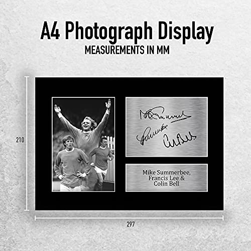 Professioneel gemaakt in onze studio, dit A4 (297x210mm) niet-ingelijste Mike Summerbee, Francis Lee & Colin Bell display zorgt voor een ideaal cadeau-idee. Deze laser bedrukte kwaliteit foto is gemonteerd in een precisie gesneden drie venster zuurvrij mat zwart display board. Links van het display bevindt zich de hoofdafbeelding. Rechts van het display bevinden zich twee metalen effectplaquette gebieden voor gedrukte kopieën van de naam en handtekening. Deze steunen worden ook geleverd met een ridgid draagbord waardoor ze zeer stevig zijn en kunnen worden weergegeven of opgehangen zoals ze zijn. Als u ze wilt inlijsten, passen ze in elk A4 Frame. Als alternatief bieden wij ook een ingelijste versie. Lichtgewicht, maar van de hoogste kwaliteit, dit is het ideale kerst- en verjaardagscadeau voor fans van alle leeftijden, en het beste van alles, ze zullen zeker niet de bank breken!