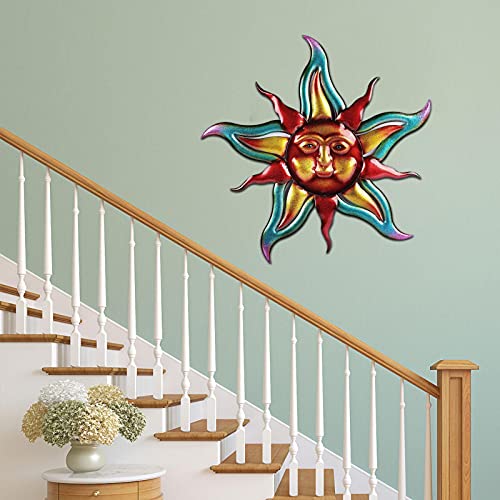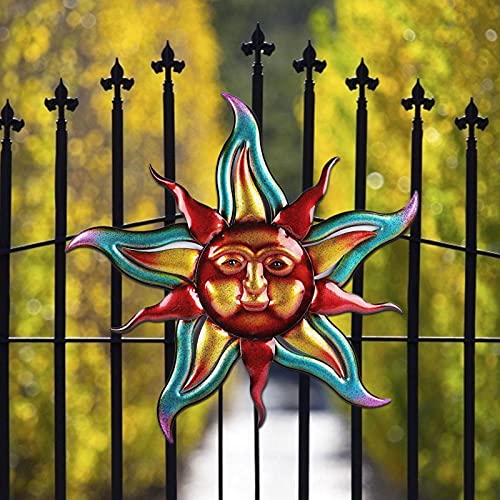 Tuinhanger: onze kleurrijke metalen zonnemuurkunst is de perfecte aanvulling op buitendecoratie. Dit mooie zonnegezicht is met speciale kleurstoffen geverfd en kan op metaal worden geplakt en heeft een doorschijnende, glanzende en metalen textuur. De filigraan tinten geven hem een unieke en geraffineerde uitstraling. Dit is een decoratie voor het hele jaar door die je huis een prachtig tintje geeft.